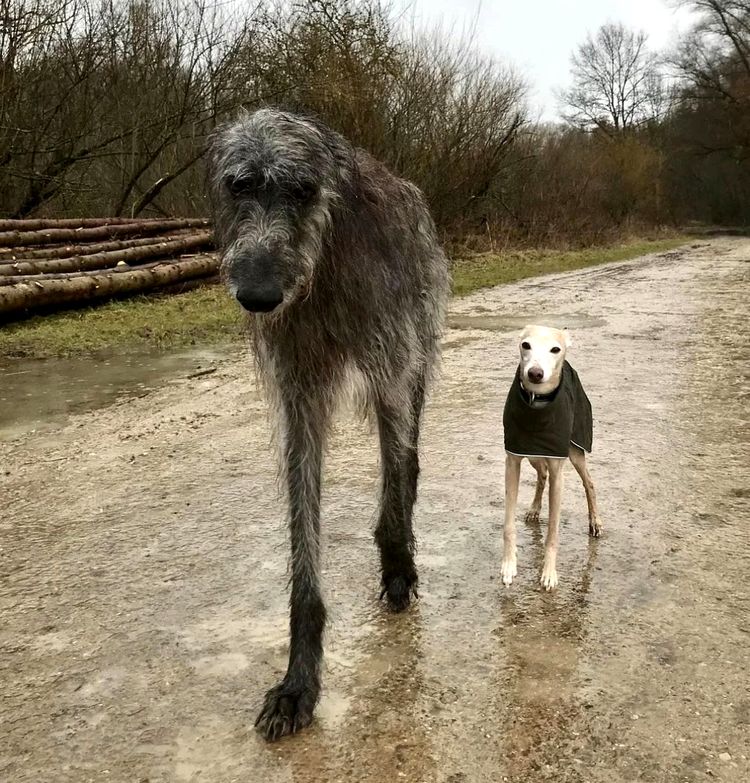 Ирландский волкодав рядом с уиппетом - разница в этаж