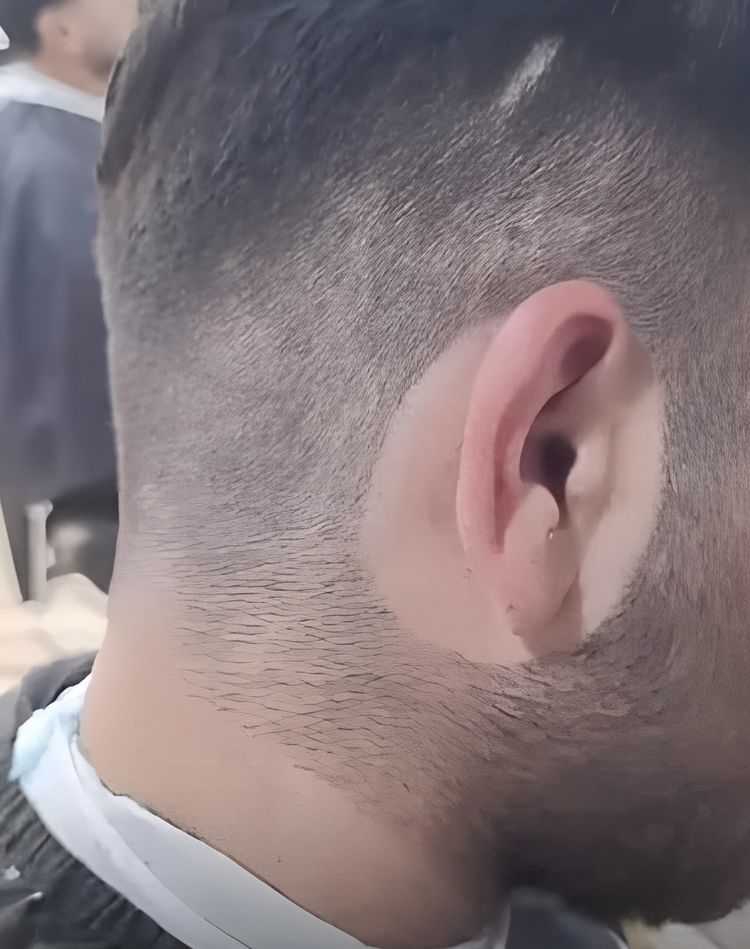 Борода плавно перетекает в затылок, а между ними - идеально выбритая полоса. Выглядит так, будто голову надевали отдельно.