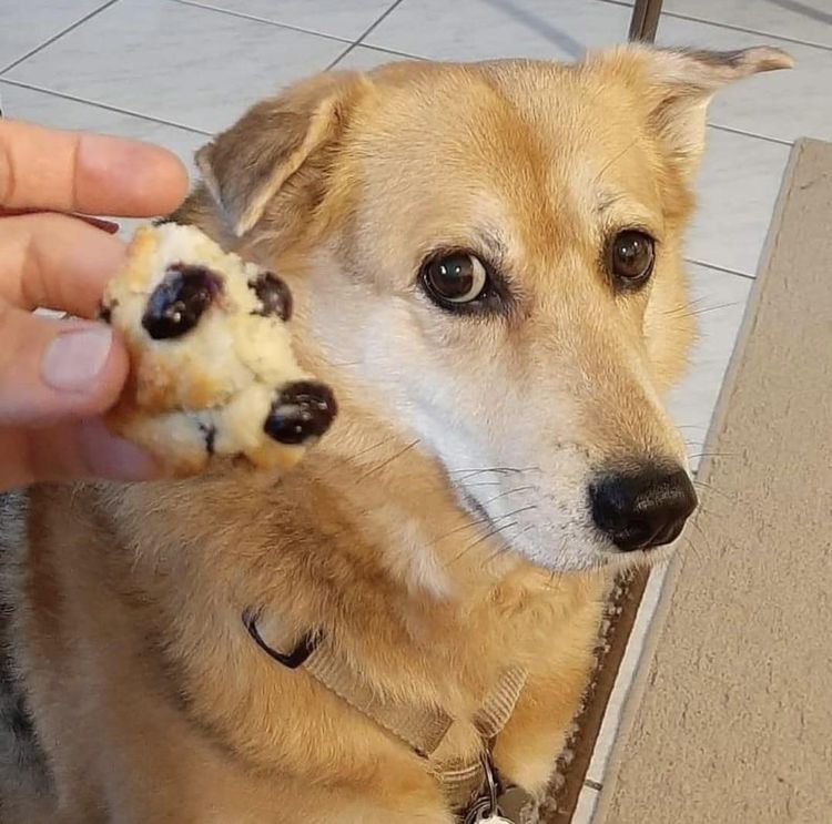 Выражение морды говорит всё: «Если вы готовы сожрать кекс, который выглядит как я, то чем я хуже?» Пёс явно в панике и уже мысленно составляет завещание.