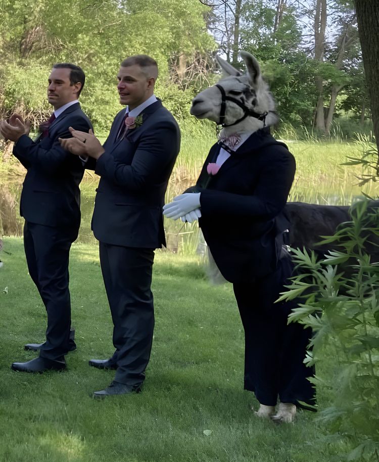 На свадьбе не хватило одного гостя, зато была свободная лама. Куст удачно прикрывает всё, что ниже спины, поэтому половина гостей до сих пор думает, что это чувак в очень реалистичной маске. Кутюрье, сколько стоит смокинг на размер XXL с длинной шеей?
