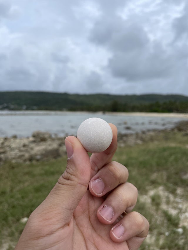 Камень на пляже - такой круглый, что хочется забрать домой и поставить на полку как произведение искусства.