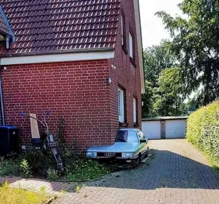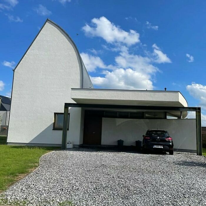 Когда навес для машины выглядит более адекватно, чем сам дом. Приоритеты расставлены максимально странно.