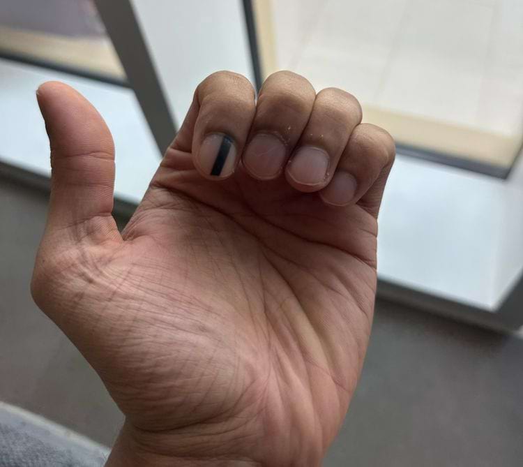 Это явление называется меланонихия. Автору рекомендовали обязательно проконсультироваться с врачом, чтобы исключить риск меланомы.