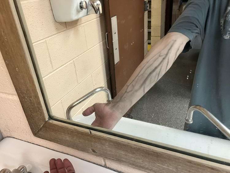 Один из комментаторов поделился яркой ассоциацией: «Это точь-в-точь как сцена в каждом фильме про зомби, где персонаж, прятавший укус половину фильма, отходит, чтобы проверить его…» Предположительно, во время физической работы вены автора расширились и стали более выпуклыми, из-за чего их контакт с пылью и грязью усилился.