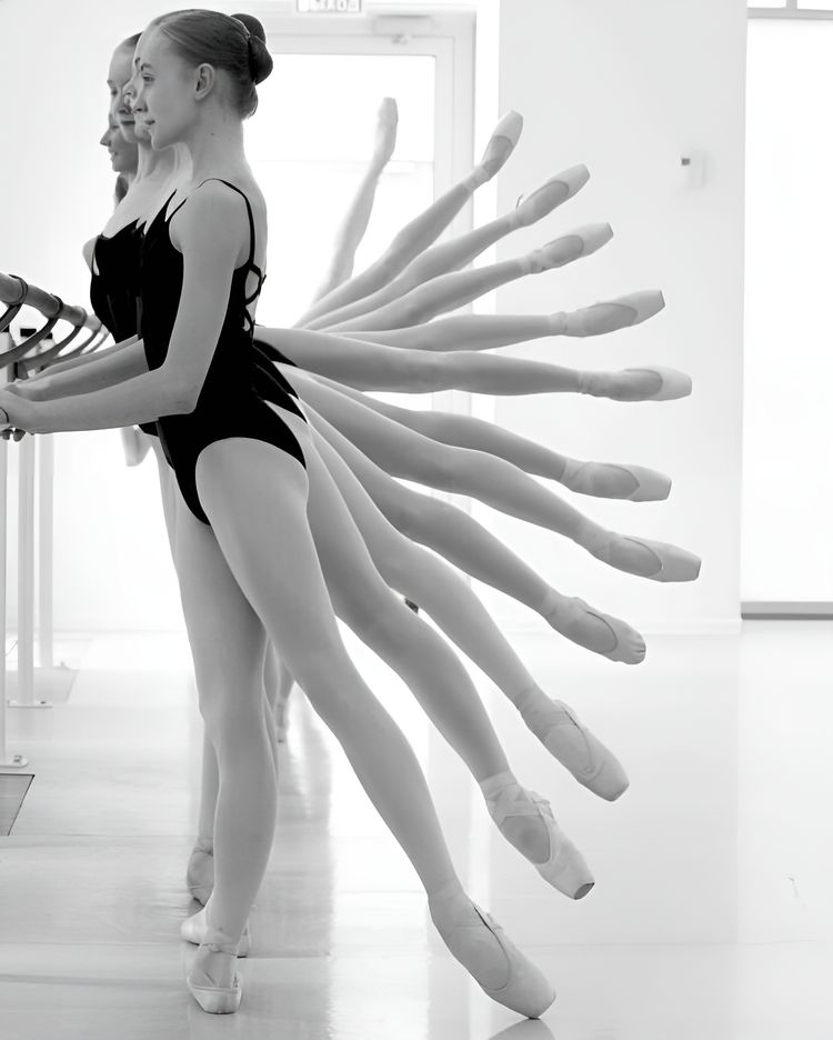 Чтобы получить этот кадр, двенадцать балерин попросили выстроиться в линию и поднять ногу на определенную высоту. Легче всего, очевидно, пришлось той, что стояла ближе всех к объективу.