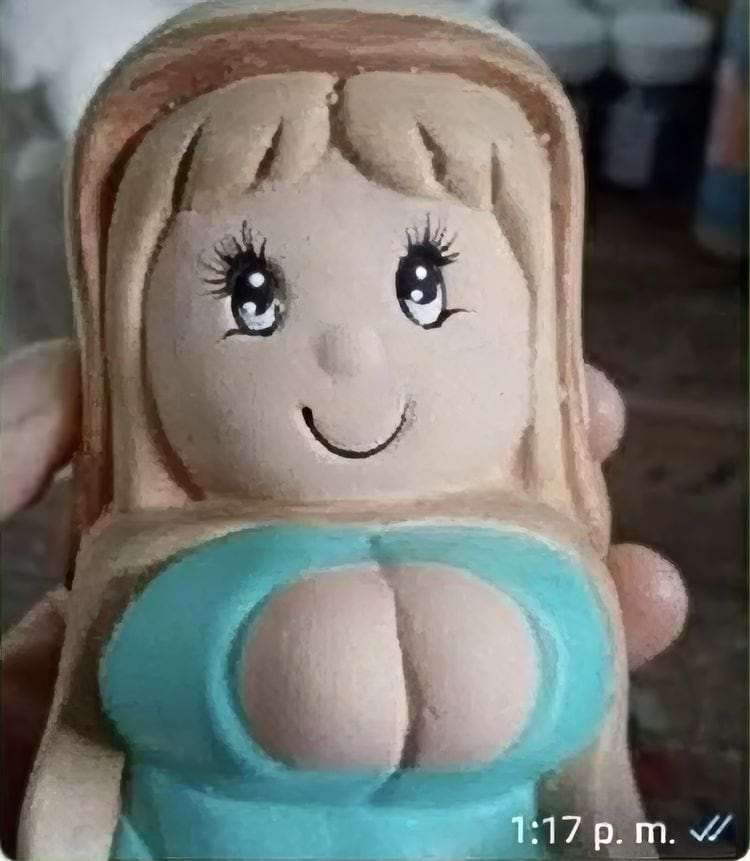 У многих при взгляде на эту куклу разгуляется фантазия, но на самом деле она просто сложила руки в молитве. Всё остальное - лишь складки бежевого плаща.