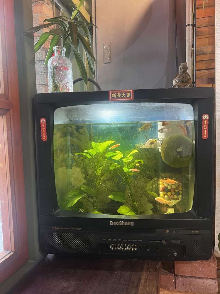 Вторая жизнь техники. В китайском кафе нашли применение старому телевизору, превратив его в уютный аквариум.
