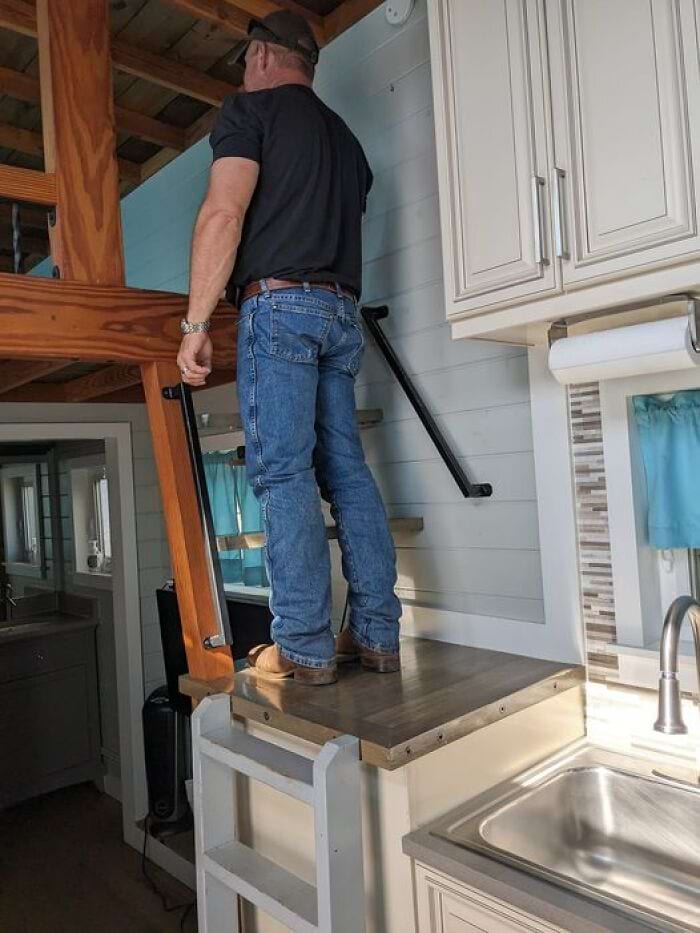 План действий такой: поднимаемся по лестнице прямо на кухонный стол, а оттуда карабкаемся в спальню на чердаке. То, что поручень находится на уровне ваших стоп - это пустяки. Главное - верить в себя