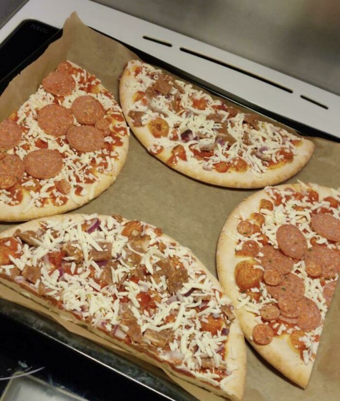 Если компания большая, а противень один, просто разрежьте обе пиццы пополам и положите их прямыми срезами к краям формы. В центре останется место для легких закусок или гренок, которые можно разогреть одновременно с основным блюдом.