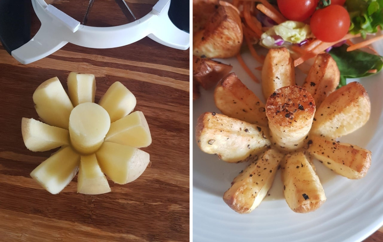 Обычный нож для нарезки яблок идеально подходит для картошки. Чтобы инструмент не соскальзывал, слегка срежьте донышко картофелины для устойчивости. Одно движение - и у вас аккуратные ломтики для запекания в духовке.