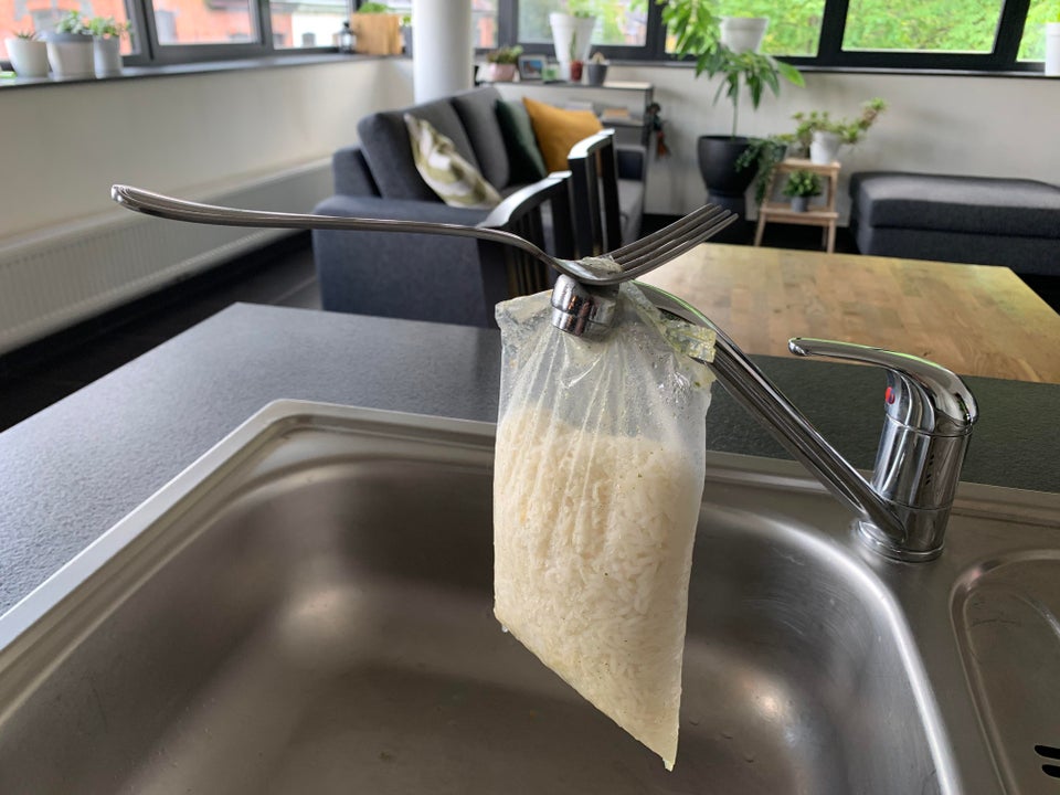 Вместо того чтобы обжигаться паром, подвесьте пакетик с готовым рисом на ручку кастрюли или кран с помощью вилки. Гравитация сделает все за вас, и лишняя вода стечет сама за пару минут.