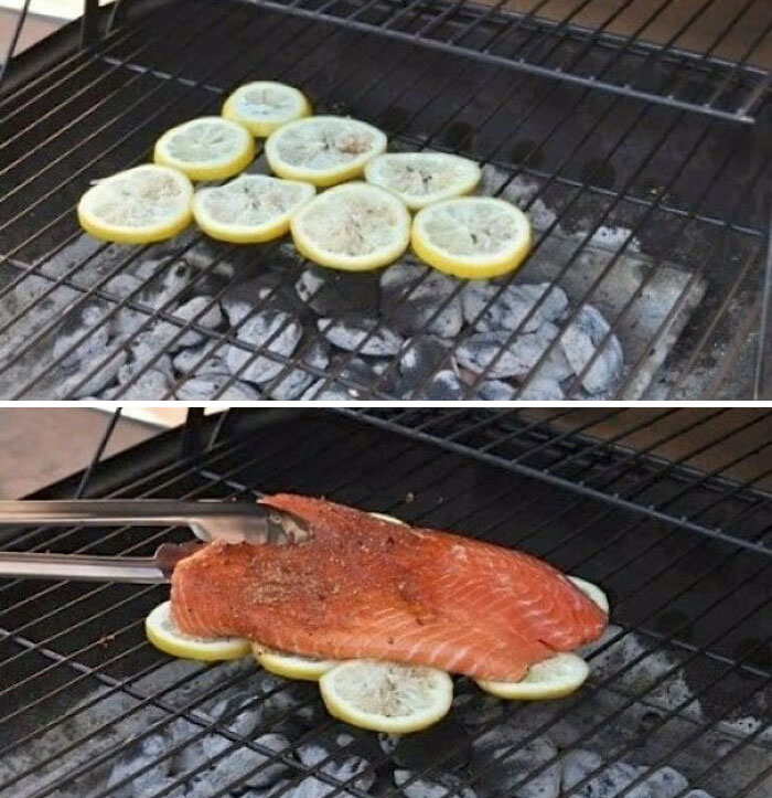 Если не хотите отмывать гриль от присохшей рыбы, выложите ее на слой кружочков лимона. Лимон защитит нежное филе от прилипания и подарит тонкий цитрусовый аромат. Если нужна корочка, в самом конце просто сдвиньте рыбу на решетку на одну минуту.