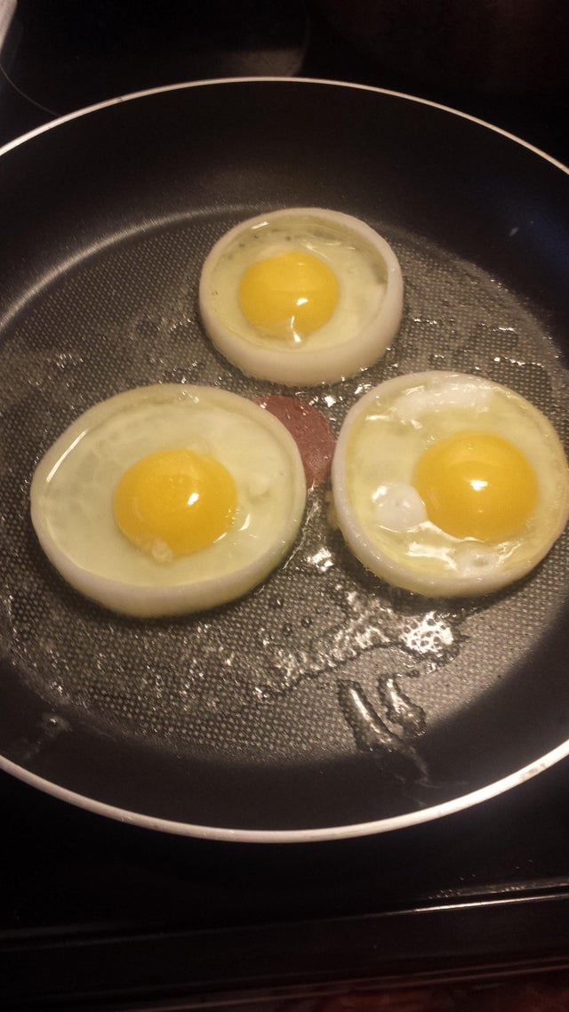 Для создания идеально круглого завтрака используйте толстые кольца лука. Они удержат белок от растекания. Главное - подбирать кольца под размер яйца, чтобы содержимое не «сбежало» из-под импровизированной формы.