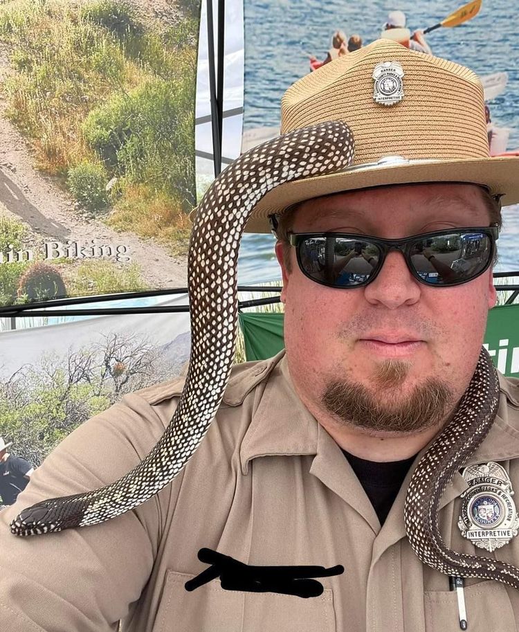 Рейнджер и его «дырявая» шляпа. Змея проползла через аксессуар так ловко, что кажется, будто она прошла сквозь голову человека. К счастью, пострадал только наш вестибулярный аппарат. 🐍