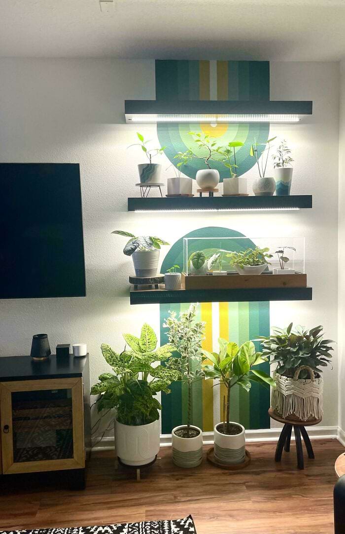 Когда муж строит «плавающие» полки с фитолампами, а жена превращает стену за ними в художественное полотно, получается идеальный тандем техники и искусства.