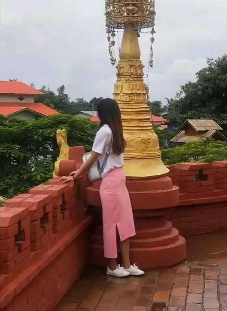 Узел из конечностей: на первый взгляд кажется, что тело живет своей жизнью. Секрет прост: девушка оперлась на перила, отведя руки назад, и просто повернула голову к камере.