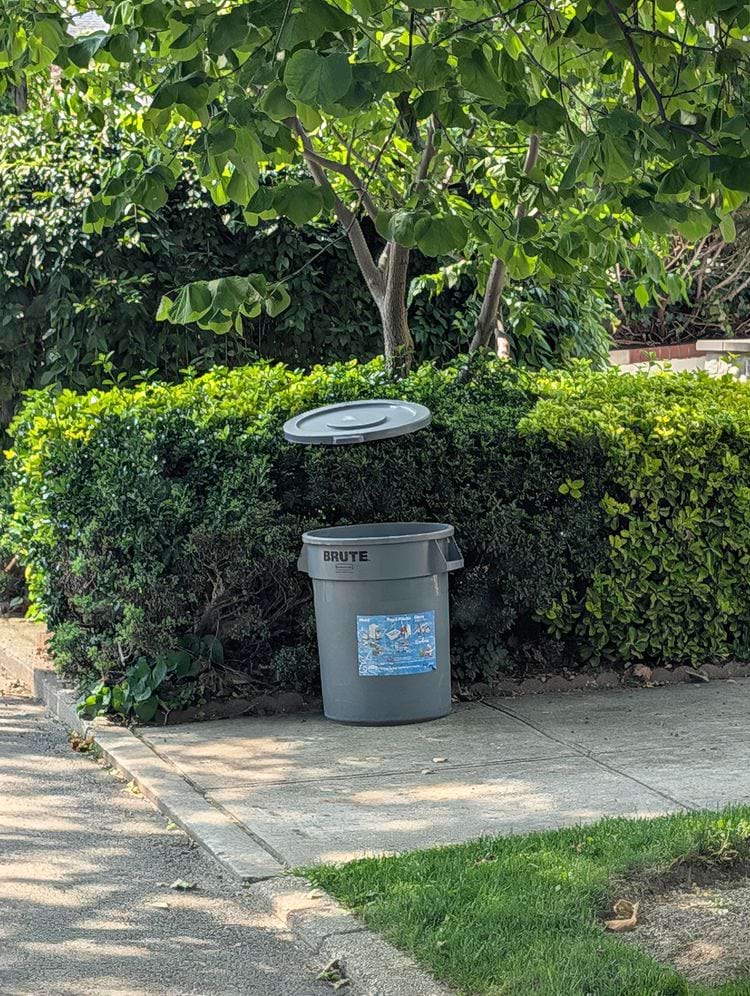 Летающий мусор: крышка бака застыла в воздухе? Нет, она просто аккуратно пристроена на вершине идеально подстриженной живой изгороди.