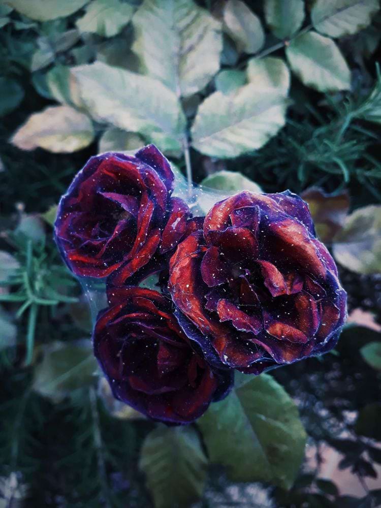 Розы, затянутые паутиной, выглядят как невесты в фате. Романтично, если не думать о том, какой вредитель устроил здесь этот бал.