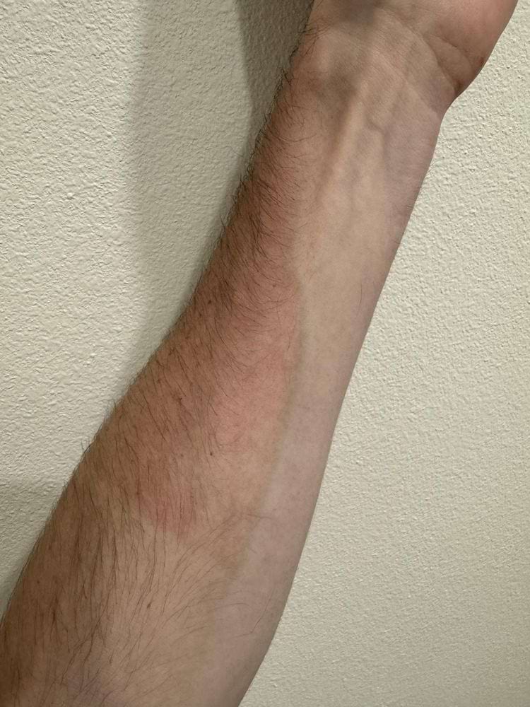 Загар лег так ровно, что повторил контур вздувшейся вены на руке. Автор фото долго рыбачил в одной позе, и вена сработала как крошечный солнцезащитный зонтик. Такую точность не повторит ни один мастер тату.