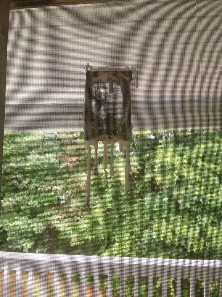 Заплатка от бога: Владелец квартиры решил проблему дырки в москитной сетке радикально. Смотреть больно, зато комары (наверное) в замешательстве.