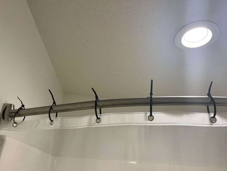 Стяжки вместо колец: Когда лень идти в магазин за кольцами для шторы в ванную, в ход идет мужская смекалка. Пластиковые стяжки - дешево, сердито и очень индустриально.