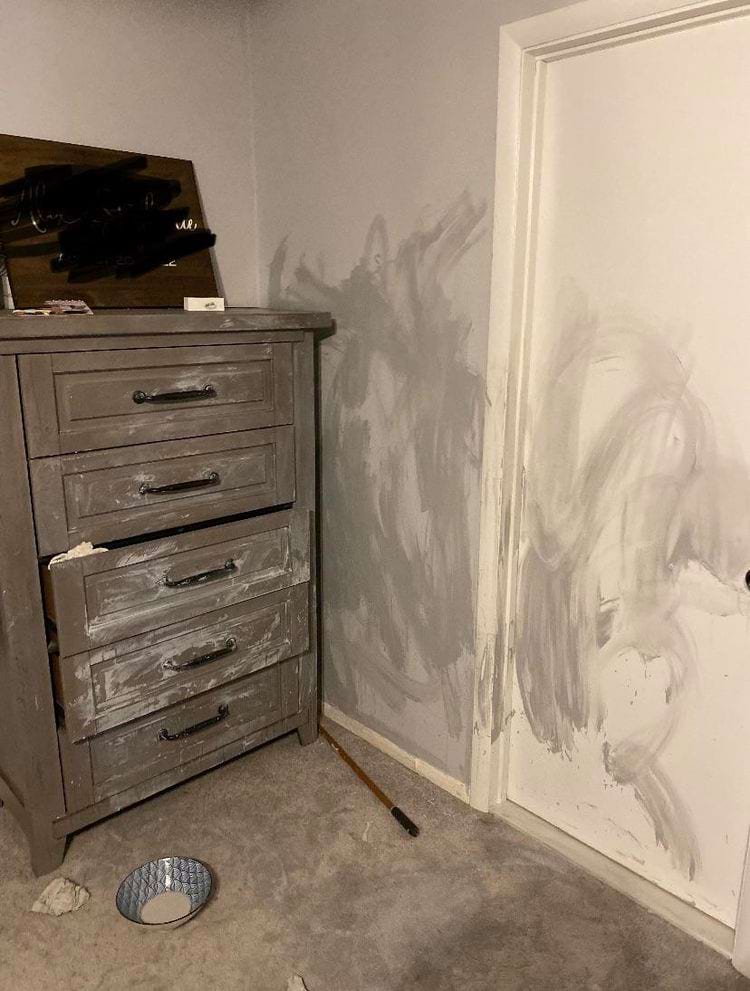 Красочный апокалипсис: Ведро краски, летящее с чердака, превращает ковер и комод в полотно в стиле абстрактного экспрессионизма. Жаль, что отмывать это придется долго.