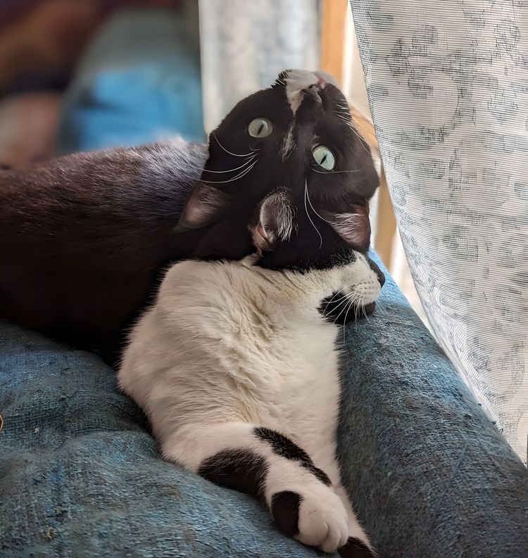 Чтобы перестать видеть здесь пришельца, нужно осознать: в кадре две кошки. Одна запрокинула голову так сильно, что её мордочка оказалась прямо между ушей подруги.