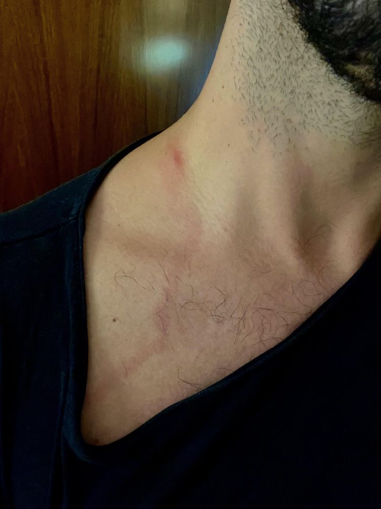 След яда: Красные дорожки на шее после укуса клеща, идущие по лимфоузлам.