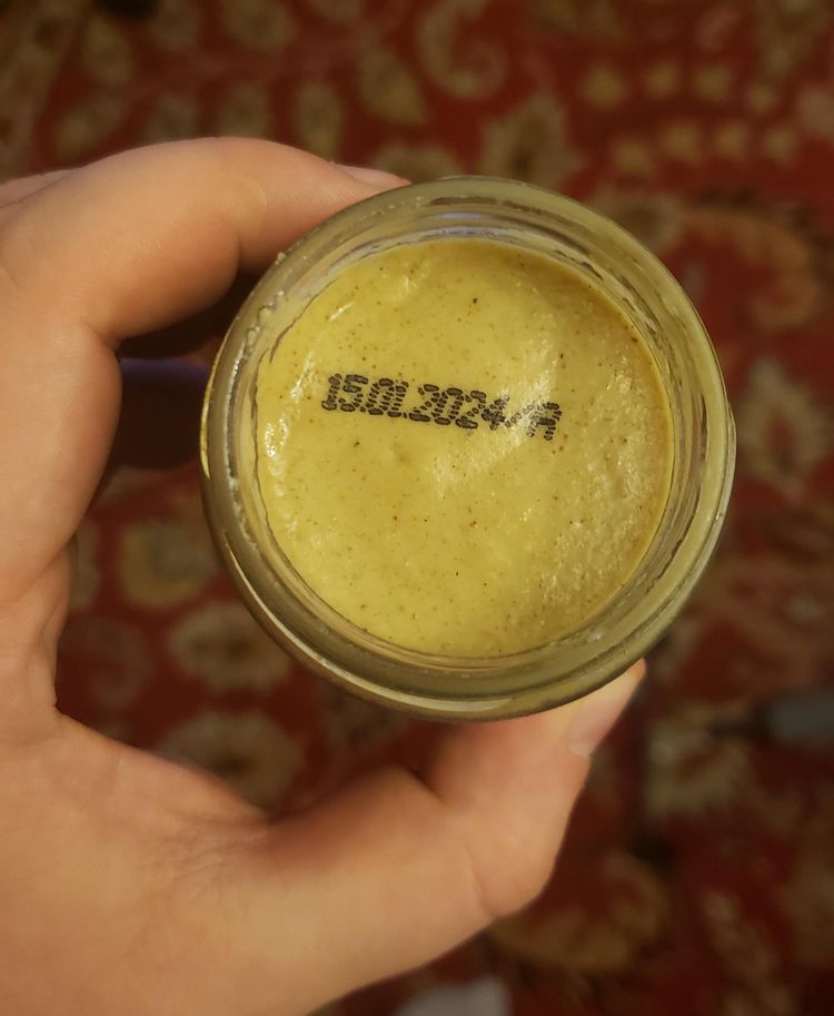 Горчица со штампом: Срок годности, напечатанный прямо на поверхности соуса.