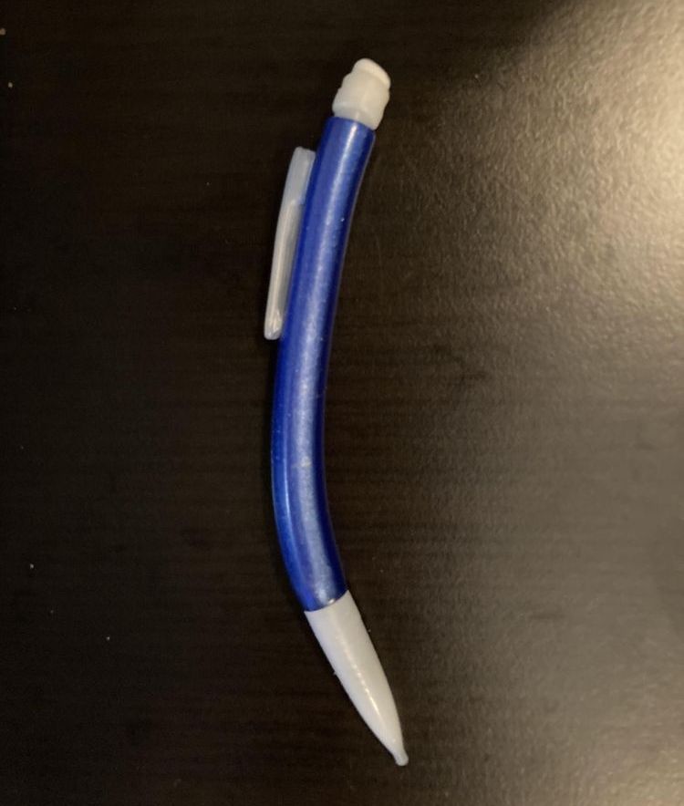 Обычный механический карандаш приобрел футуристические изгибы после цикла в стиральной машине. Высокая температура при сушке оплавила пластик, деформировав корпус. Однако инструмент сохранил «голос»: при встряхивании внутри отчетливо слышен стук уцелевших кусочков графита.