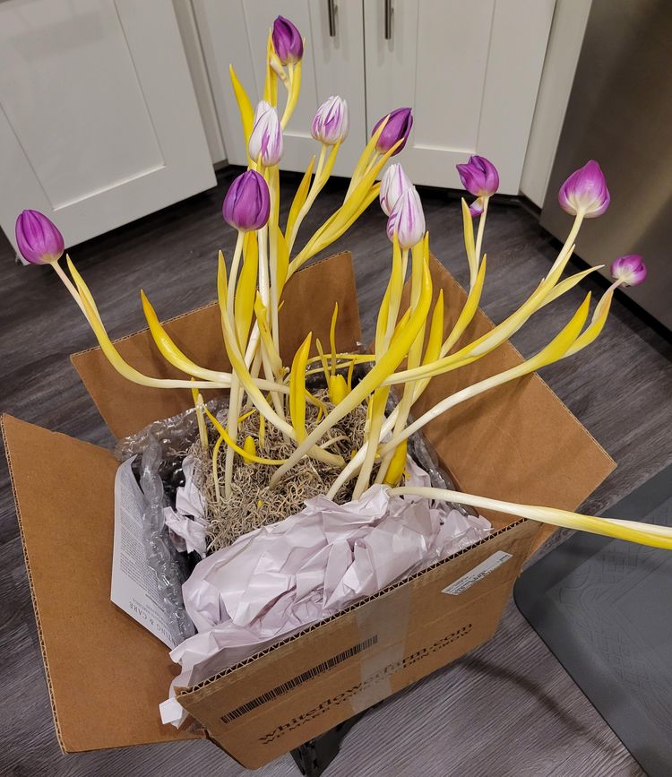 Тюльпаны, забытые в закрытом шкафу, проросли без капли воды и доступа к свету. Растения использовали накопленные в луковицах ресурсы. Это временное выживание: без фотосинтеза цветы были обречены, но владелец вовремя обнаружил «пленников» и вернул их на подоконник.