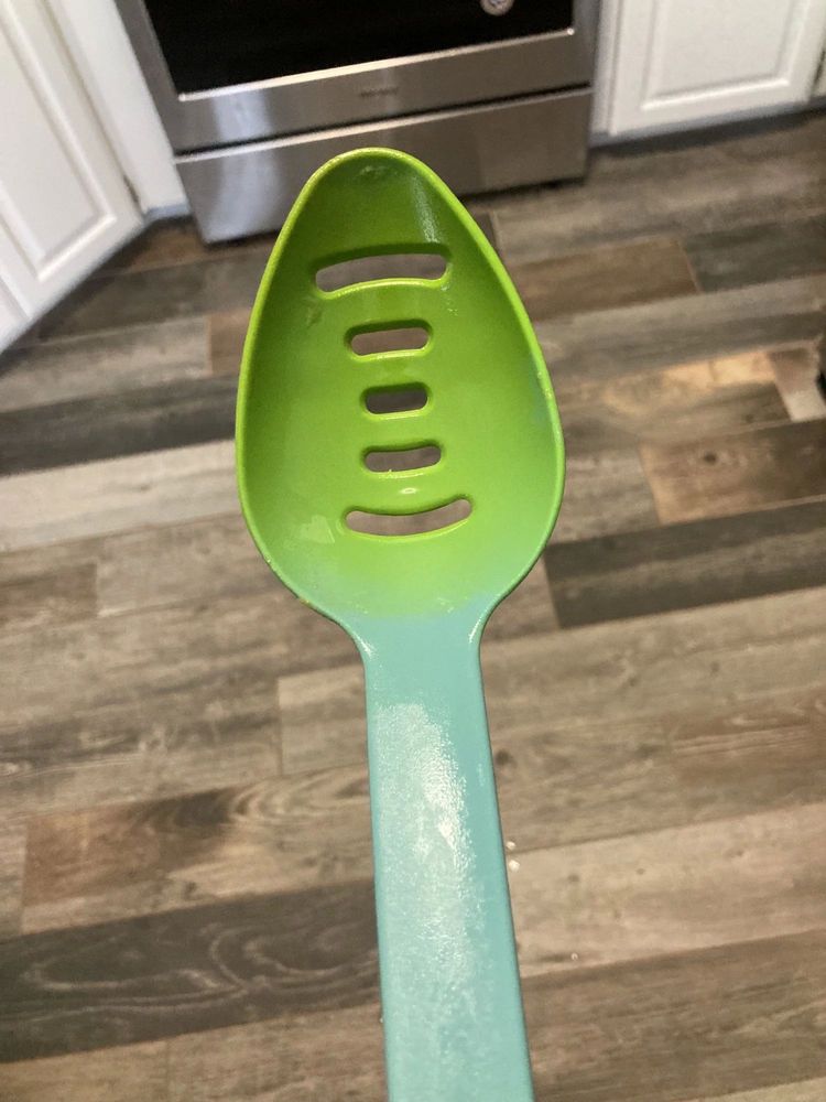 Голубая ложка для перемешивания карри внезапно стала ярко-зеленой. Секрет в куркуме: этот природный краситель дает насыщенный желтый пигмент. В сочетании с синим цветом пластика получился чистый зеленый оттенок.