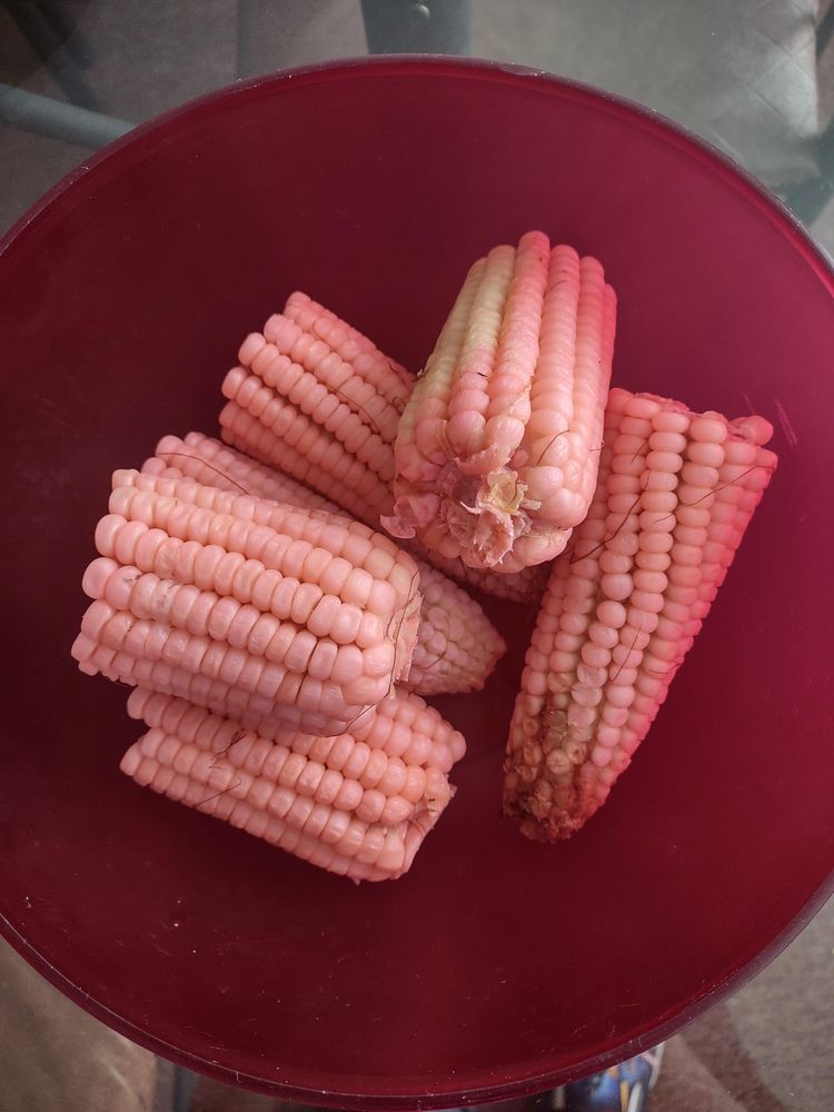 Фиолетовый картофель, сваренный вместе с кукурузой, превратил обед в арт-объект. Кукурузные зерна впитали антоцианы (природные пигменты) из картофеля и стали нежно-розовыми.