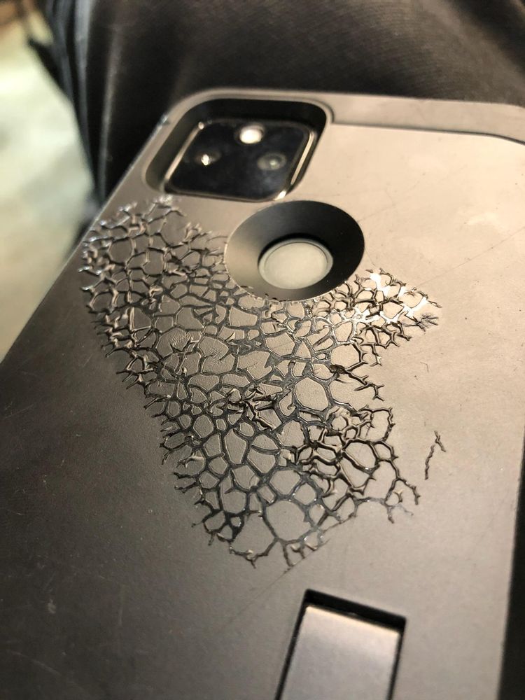 Сотрудник аэрокосмической отрасли случайно положил смартфон в лужицу ацетона. Агрессивный растворитель мгновенно вступил в реакцию с пластиковой крышкой, превратив ее в нечто, напоминающее застывшую лаву. Повторять такой «тюнинг» крайне не рекомендуется.