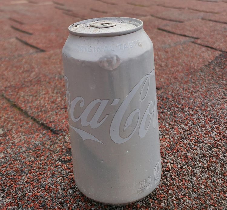 Банка колы, оставленная на крыше на долгий срок, полностью лишилась красного цвета - солнце буквально «выжгло» пигмент с металла. При этом давление внутри достигло критического уровня: банка опасно раздулась и готова взорваться от любого прикосновения.