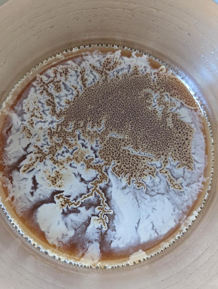 Кофе с овсяным молоком, оставленный на ночь в тепле, за несколько часов превратился в подобие чашки Петри. Растительные жиры и сахара стали идеальной средой для быстрого роста бактериальных колоний.