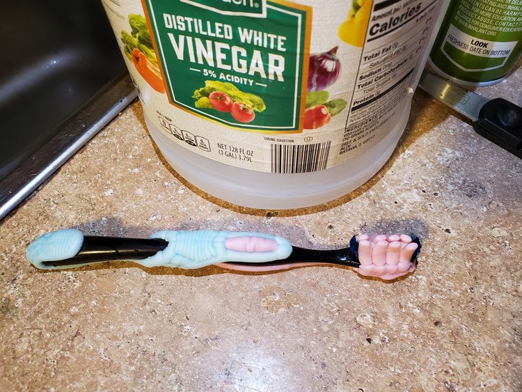 Зубная щетка после нескольких месяцев в уксусной эссенции изменилась до неузнаваемости. Резиновые элементы впитали состав и разбухли, полностью скрыв под собой щетину. На ощупь эти наросты остались твердыми, но абсолютно гладкими.