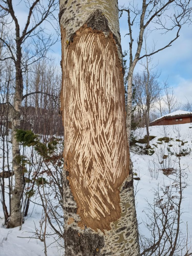 Ствол дерева со странными глубокими бороздами сначала приняли за результат «чесания» рогов лося. Однако реальность суровее: в середине зимы копытные переходят на поедание коры. Позже автор подтвердил, что это следы зубов голодного зверя.