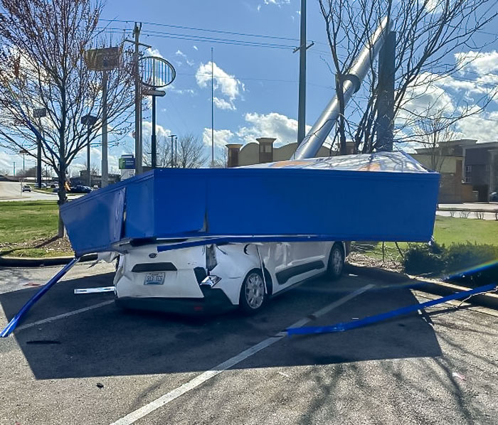 Рекламный щит рухнул прямо на автомобиль через 15 секунд после того, как водитель из него вышел. С одной стороны - груда металла, с другой - потенциальный судебный иск к ресторану, который обеспечит владельцу покупку машины классом выше. Главное, что сам счастливчик не стал «начинкой» для этого железного блина.