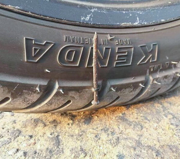 На фото - шина, в которую на полном ходу вонзился огромный гвоздь. Но вот чудо: он прошел строго через протектор, не задев герметичный слой. Это не просто везение, это какой-то «пирсинг» для авто, сэкономивший владельцу нервы и круглую сумму на новый комплект.