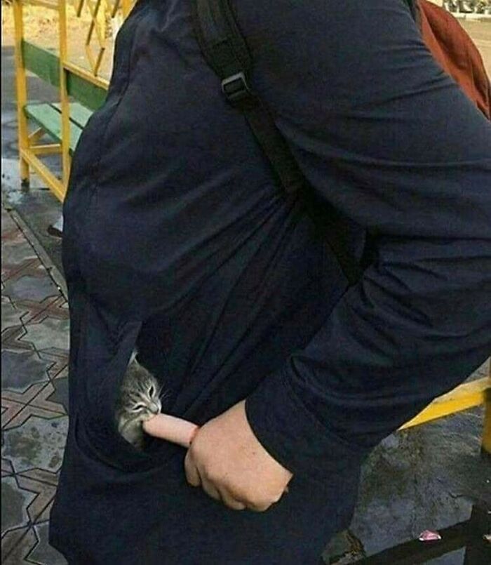 Кот аккуратно спрятан в кармане - универсальный антистресс и моральная поддержка в одном комплекте.