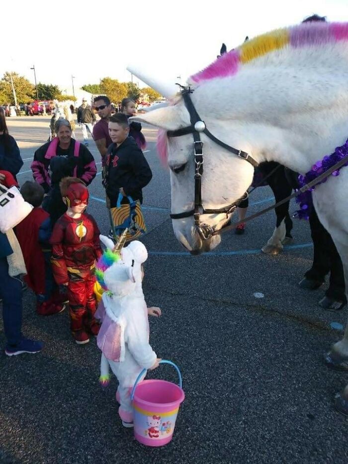 Ребёнок в костюме единорога встретил… настоящего единорога. И, кажется, даже он не был к этому готов.