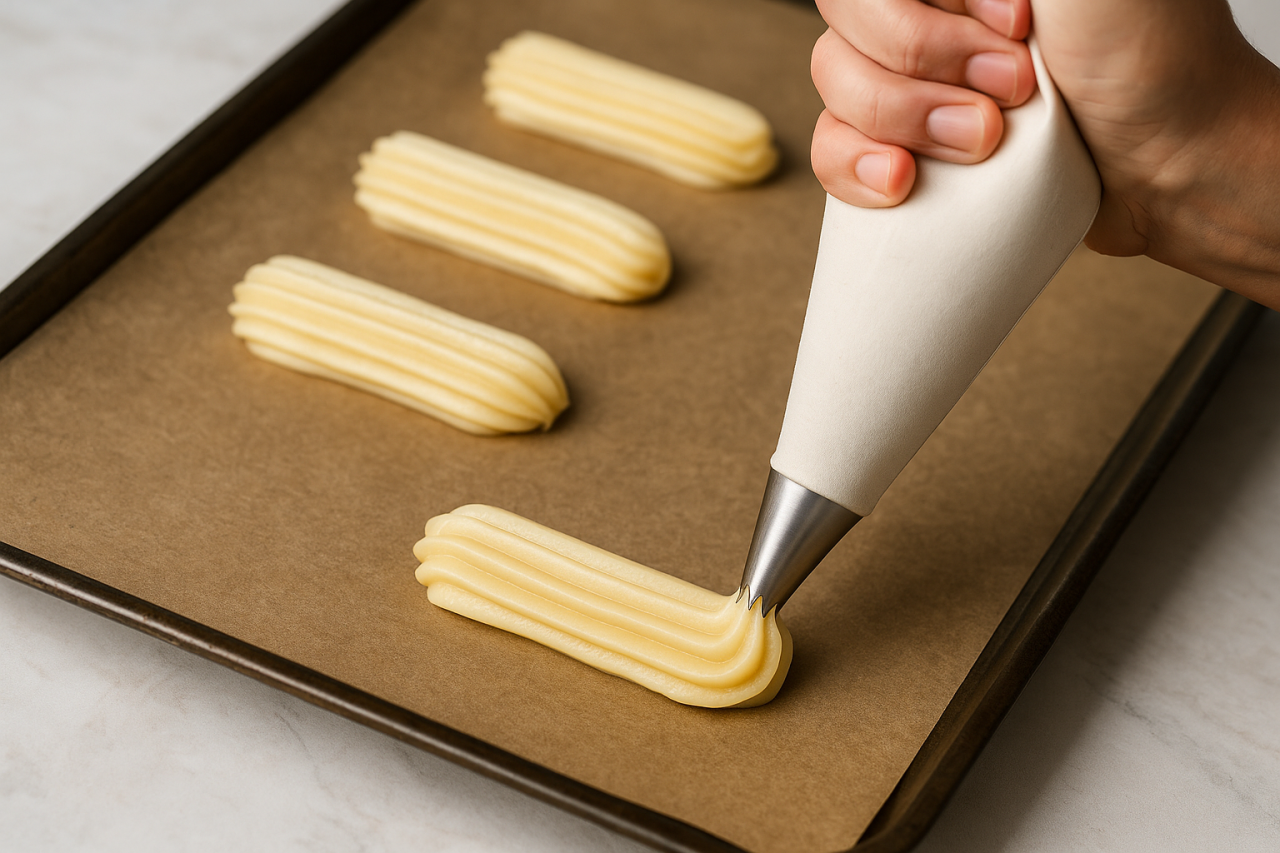 Переложите тесто в мешок с насадкой 12–14 мм. Отсадите эклеры длиной 10–12 см на пергамент, расстояние 3–4 см. Кончики пригладьте влажным пальцем. Слегка сбрызните поверхность водой.