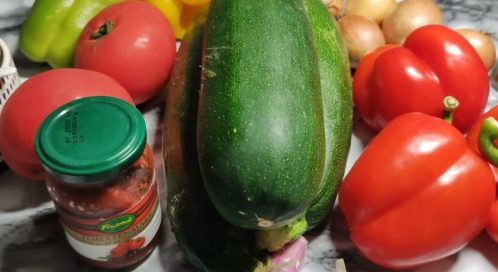 Кладем в маринад кабачки и, помешивая, варим 10 минут. Далее кладем репчатый лyк, варим 5 минут, дальше - перец, варим 5 минут, и, наконец, помидоры - варим 10-15 минут.