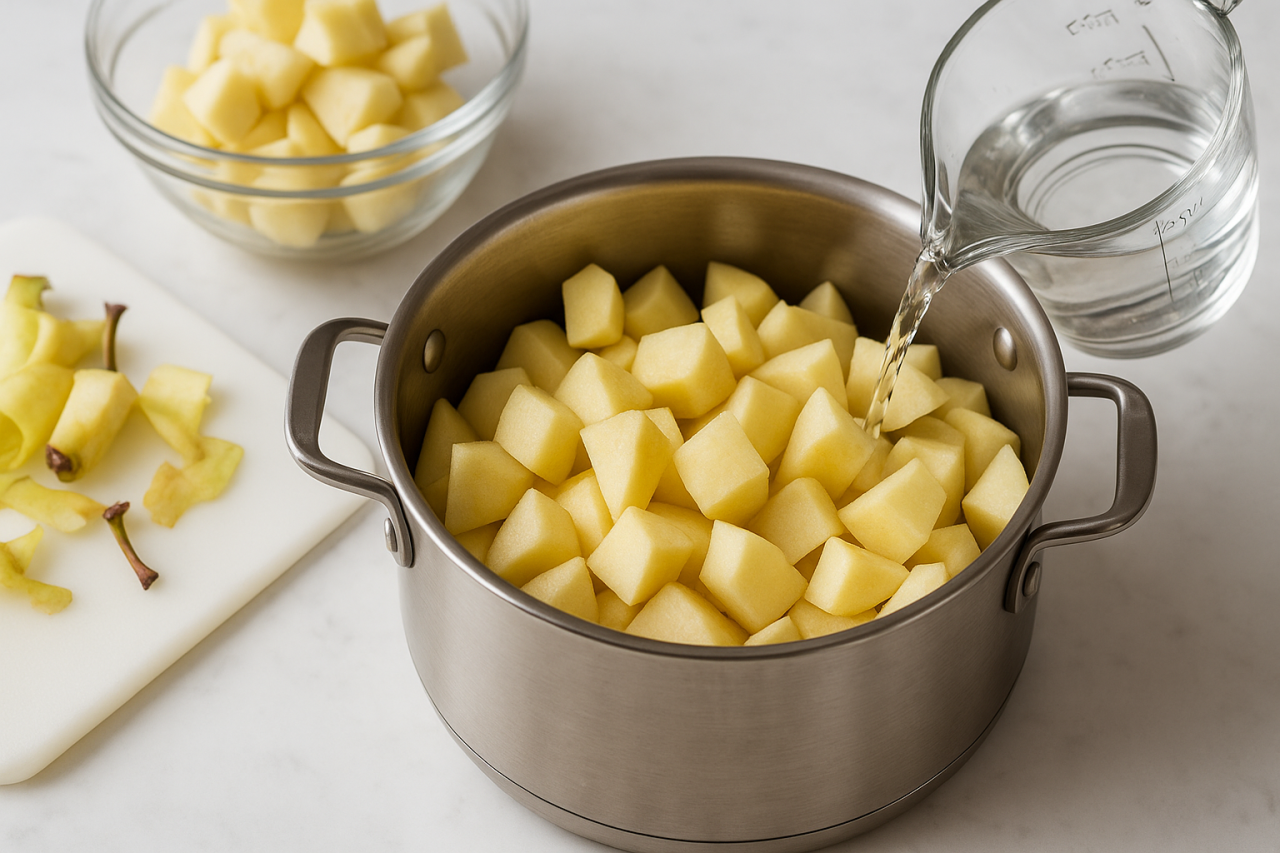 Очистите яблоки от кожуры, удалите сердцевины, нарежьте кусочками среднего размера. Сложите в кастрюлю и добавьте воду.