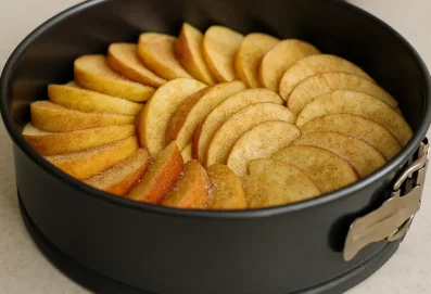 Можно немного «утопить» яблоки в тесте, чтобы они красиво выглядывали.