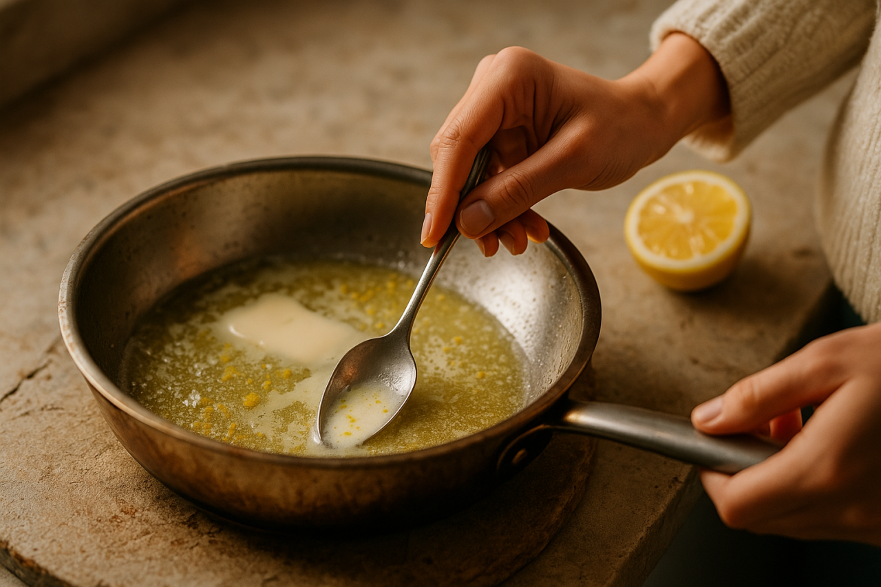 2. Растопите масло. В широкой сковороде на среднем огне добавьте сливки, немного бульона, лимонную цедру и каплю сока.