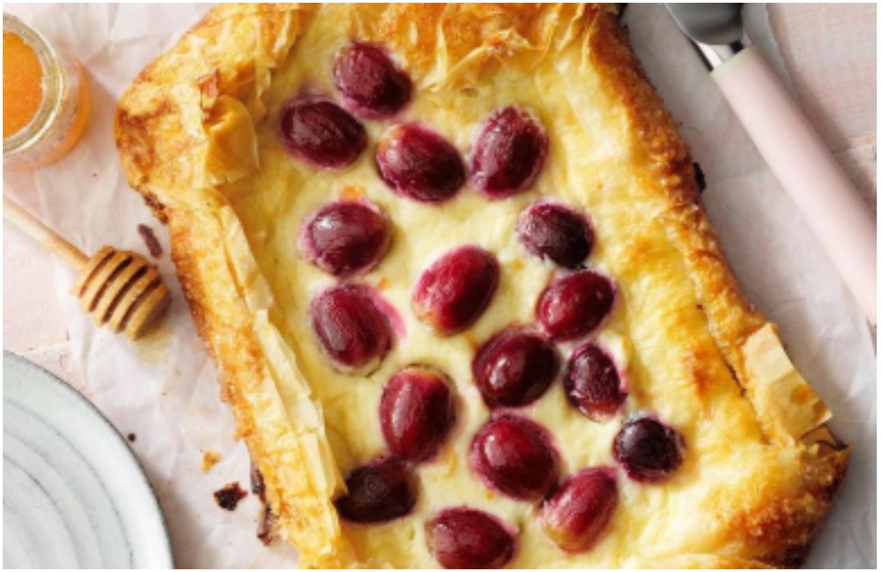 С приближением Нового года многие традиционно едят виноград, загадывая желания на каждый из 12 его зернышек. Почему бы не превратить эту привычку в вкусный десерт? Представляем слоёный пирог из теста фило (или из простого слоеного теста) с жареным виноградом и сладким сыром.