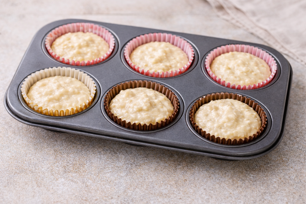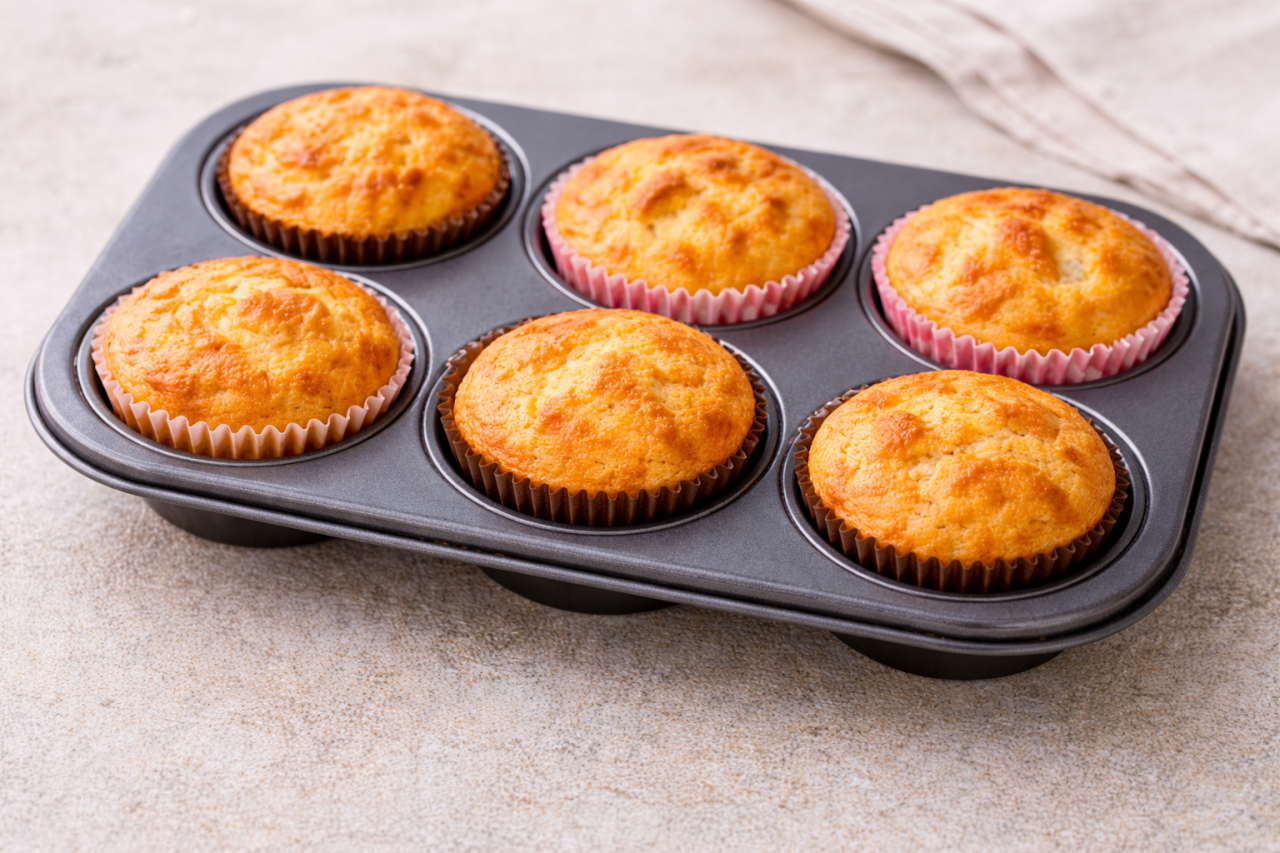 Рецепт максимально простой: продукты смешиваются в одной миске, масса раскладывается по формочкам, дальше работает духовка. В итоге получаются порционные кексы с мягкой текстурой и лёгким ванильным вкусом, удобный вариант для завтрака, перекуса, или к чаю.
