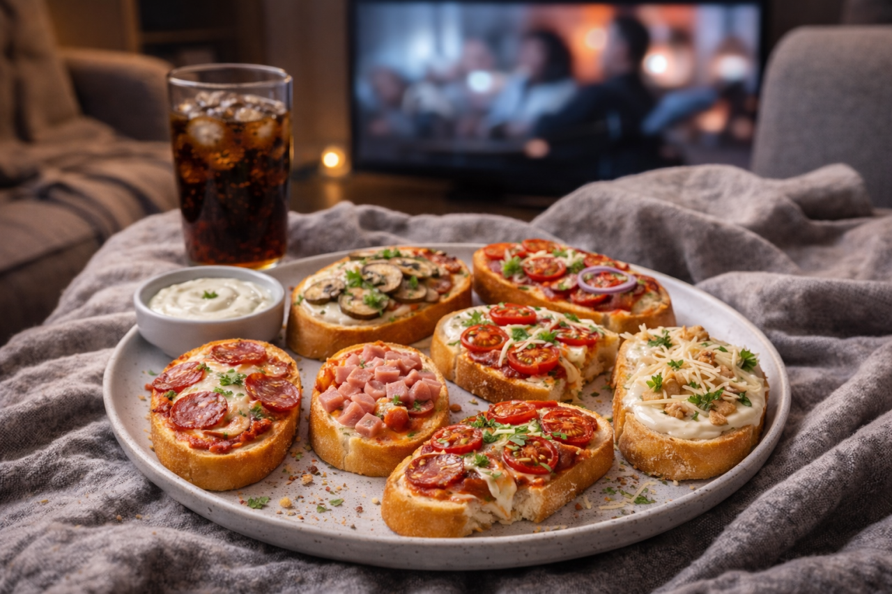 Кинотеатры давно приучили нас к простому правилу: с едой любой фильм смотрится интереснее. Хотя, если честно, мы и без них это всегда знали. Только вот дома к фильму хочется не утку в сложном соусе и не курицу с замысловатой заправкой, а что-то максимально простое: чтобы быстро, без кулинарных навыков, из понятных продуктов. Мини-пиццы на батоне, как раз такой вариант. Хрустящая основа, тянущийся сыр, любимая начинка, и всё это готовится за 12 минут в духовке.